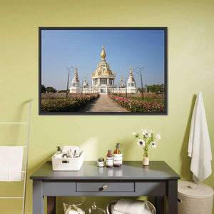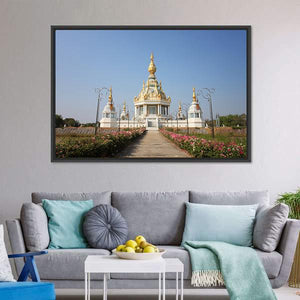 A realistic depiction of the Wat Thung temple featuring an ornate golden stupa, flanking white structures, and a garden-lined pathway. The symmetrical composition and a soft palette of white, gold, green, blue and pink create a serene, grand, peaceful mood that fits living rooms or entryways seeking calm wall decor.