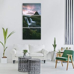 A dramatic nature photograph of a mountain waterfall and river at dusk, with a lone person standing on a cliff beneath a moody sky. Greens, blues, pinks, and grays give depth and a serene, wild atmosphere; the rule-of-thirds composition adds movement that suits modern, nature-inspired rooms and living spaces.
