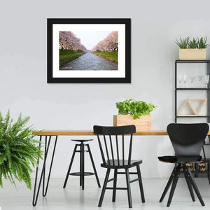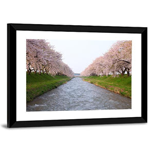 Blooming cherry blossoms line a gentle river in a realistic, serene scene that uses symmetrical, converging lines to guide the eye. Soft pinks, greens, blues and white give the piece a picturesque, calming feel that suits modern or nature-inspired living rooms and bedrooms.