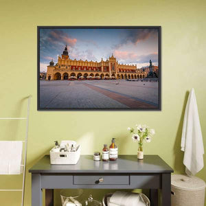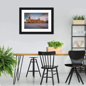 This realistic cityscape shows Krakow’s Cloth Hall and the surrounding town square, with an arched colonnade, clock tower and cobblestone pavement beneath a dusk sky with clouds. The wide-angle, low-perspective view and a palette of brown, orange, blue, grey and pink create a grand, calm, historic mood; it fits room decor in living rooms or entryways with modern interiors.