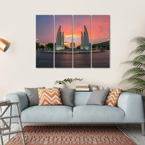 Capture the vibrant beauty of Bangkok's Democracy Monument against a dramatic sunset sky. This piece features rich colors like orange and purple, highlighting the stunning architectural details of the monument and its golden statue. It's a striking addition to any room decor.
