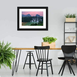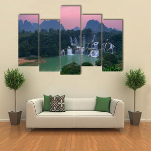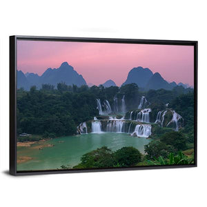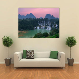 Detian Waterfall At Sunset depicts cascading waterfalls, mountains, a river and forest washed in dusk tones of green, blue and pink. The naturalistic composition uses depth and the rule of thirds to convey a peaceful, majestic mood. Suits modern living rooms or bedrooms as nature-focused room decor.