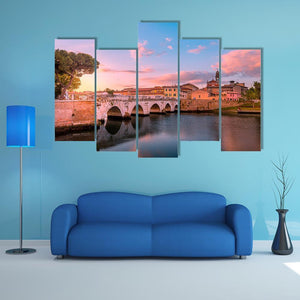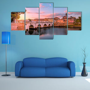 Famous Bridge in Rimini shows an arched bridge over a river with buildings beneath a pink-and-blue sunset sky, rendered in a realistic landscape. Soft orange and white highlights and reflections on the water create a peaceful, contemplative mood. Suited to modern room decor such as living rooms or bedrooms.