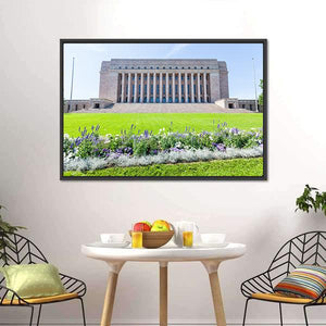 This canvas wall art features the grand Finnish Parliament House, surrounded by a serene flower bed and lush green lawn. Its realistic portrayal captures the stately architecture, making it a calming addition to any space.