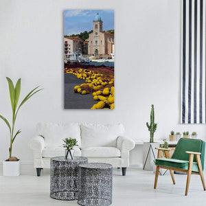Fishing Net on Port Vendres shows fishing nets and a pile of yellow buoys in a seaside harbor, with docked boats and a blue-domed church in the background. The photographic, colorful scene feels vibrant and serene and works well with coastal or nautical room decor.