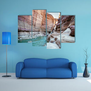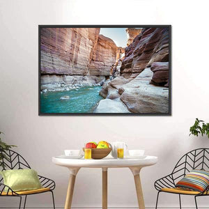 Wadi Hasa Creek in Jordan shows a sunlit, narrow canyon with striated rock walls and a clear turquoise river. Rendered in a realistic, wide-angle composition, it creates a serene, majestic mood that works well with modern room decor.