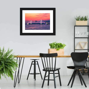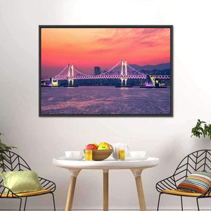 Gwangan Bridge At Night Busan Canvas Wall Art shows the illuminated suspension bridge and city skyline reflected on water beneath a dramatic purple-and-pink sunset sky. Its balanced, modern composition offers a vibrant yet peaceful nighttime mood that fits modern living spaces.