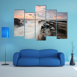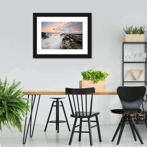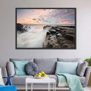 Experience the serene beauty of ocean waves crashing against coastal cliffs under a cloudy sky with this landscape canvas art. Its dramatic yet calming mood makes it suitable for any space needing a touch of nature.