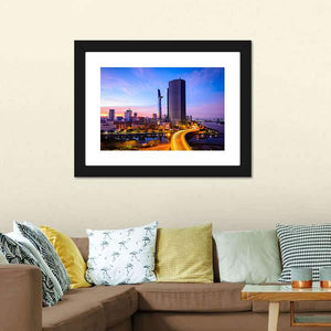 Ho Chi Minh City At Night shows a photorealistic city skyline along a river and road, with tall modern buildings and streaking traffic lights. The blue and orange palette gives the image a vibrant, energetic urban mood. It pairs naturally with modern or urban interiors and contemporary room decor.