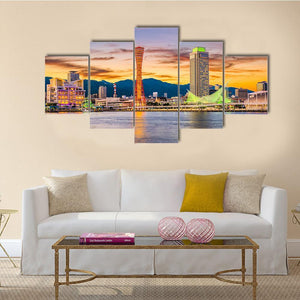 Kobe Port Skyline Canvas Wall Art presents the city skyline with its tower, bridge and waterfront beneath a glowing sunset. The modern composition uses blues, oranges, yellows and purples to create a vibrant yet serene atmosphere with illuminated buildings and water reflections. Suited to contemporary room decor like living rooms or offices.