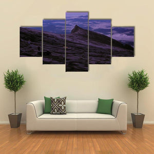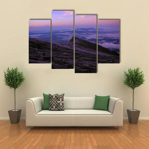 Mount Kinabalu During Dawn shows a mountain peak and cloud-filled sky lit in soft purples, pinks and blues as early light breaks. Hikers move across rocky terrain beside a visible rope guide line, giving the scene a serene, majestic and quietly adventurous mood that fits modern or nature-inspired rooms.