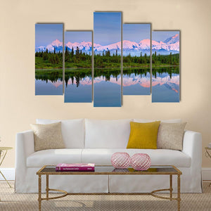 Wonder Lake at Denali shows snow-capped mountains, a forested shore and their clear reflection in a calm lake, rendered in a realistic style. Soft blues, whites, greens and a hint of pink create a serene, majestic mood that works well in modern, nature-inspired home interiors.