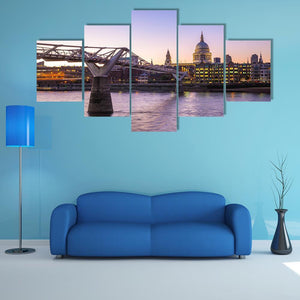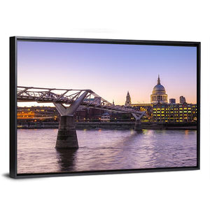St Paul Cathedral and the Millennium Bridge sit above the River Thames in this photorealistic London cityscape canvas. Soft purples, blues and warm orange lights reflect on the water at twilight, creating a serene urban mood. It suits modern living rooms, offices, or entryways with city-inspired decor.
