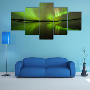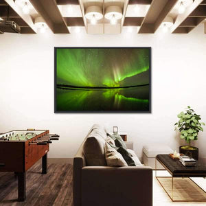 This canvas artwork beautifully captures the aurora borealis in a serene night sky, with reflections dancing on still waters. The harmonious palette of green, black, white, and pink evokes a magical atmosphere, making it an enchanting piece for nature lovers.