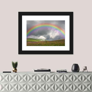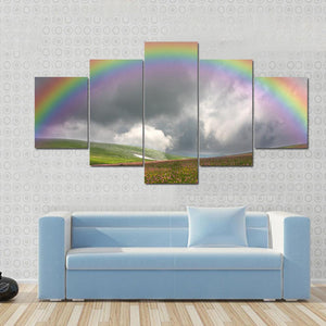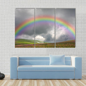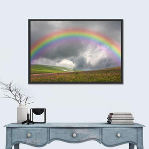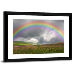 This piece features a vibrant rainbow arching over a dark, cloudy sky, with a field of pink flowers and layered green hills. Its serene yet dramatic atmosphere enhances natural beauty, making it an inviting addition to any room.