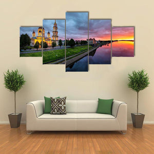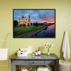 Savior Transfiguration Cathedral shows a riverside skyline with dome-shaped roofs, a tall spire and reflective water beneath dramatic evening clouds. Rendered realistically in blues, greens, yellows, greys and purples, it balances serene and dramatic tones for a historic, contemplative mood. It makes a calm focal point for living room or entryway decor and pairs well with modern interiors.