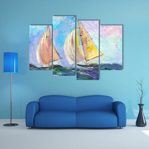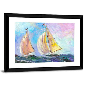 This vibrant canvas features two sailboats navigating a serene ocean, with a dynamic interplay of waves and sky. The impressionistic style, enriched with blues, greens, and pops of yellow and pink, brings a lively touch to any space.