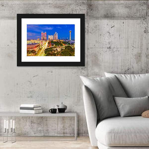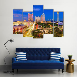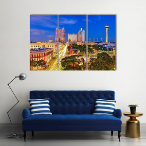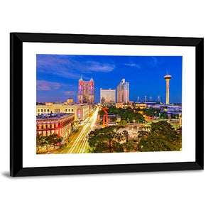 Capture the vibrant skyline of San Antonio with this modern canvas art featuring city buildings, twinkling lights, and streaking headlights. The energetic twilight palette of blues, pinks, and yellows adds a dynamic touch to your wall decor.