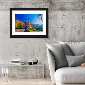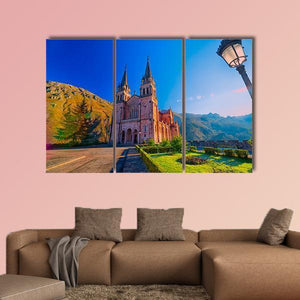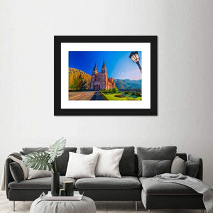 Sanctuary of Covadonga in Spain features a red sandstone cathedral with twin spires set against mountains, trees, and a manicured lawn under a clear blue sky. The realistic, sunlit scene feels serene and majestic. It works well in a living room or entryway that needs a calm, place-based landscape.