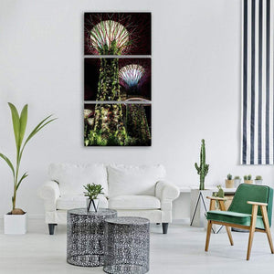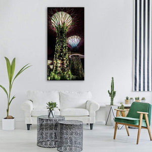 A photo-realistic night view of Singapore’s Gardens by the Bay, featuring glowing supertrees and tree-like structures covered in vegetation. Vertical symmetry and a green-white-purple palette create a mystical, futuristic, and serene atmosphere that suits modern or sci-fi–inspired interiors.