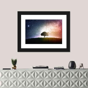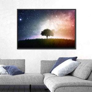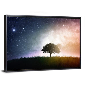 This enchanting canvas features a silhouetted tree against a dreamy night sky filled with stars and a glowing nebula. The serene palette of dark blue, purple, and pink creates a cosmic atmosphere, perfect for adding a touch of modern art to your space.
