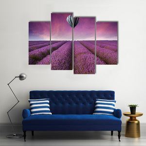 Realistic summer landscape showing a lavender field at sunset with a striped hot air balloon drifting across the sky. The rule-of-thirds composition and a soft purple-pink palette create a serene, dreamy, and slightly majestic atmosphere. It suits modern living rooms or bedrooms as calming wall decor.
