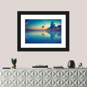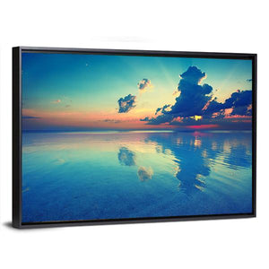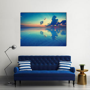 Sunrise Over Sea Canvas Wall Art shows a quiet ocean sunrise with sun rays piercing through clouds and calm water reflecting the sky. Its blue, orange, pink and yellow palette creates a serene, peaceful mood that works well in modern living spaces and bedrooms.