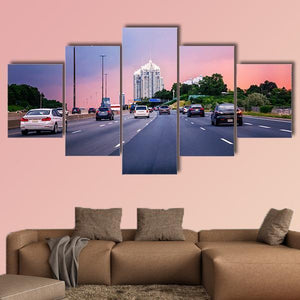 This canvas captures a twilight cityscape—highway lanes, passing cars and tall buildings punctuated by traffic lights and streetlights. Cool blues and purples with pink, white and black accents convey a transient, urban dusk in a modern style. It suits contemporary room decor such as modern living rooms or offices.