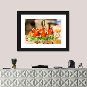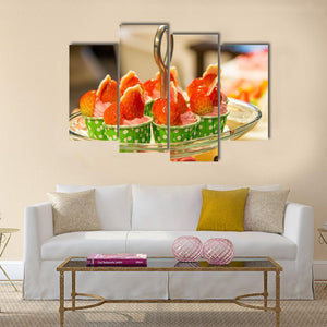 Cupcakes topped with fresh strawberries are captured in a close-up food photograph that reads sweet and festive, with a shallow depth of field. Pink frosting and green polka-dot wrappers bring colorful, inviting accents—an easy choice for kitchen or dining room decor in a modern home.