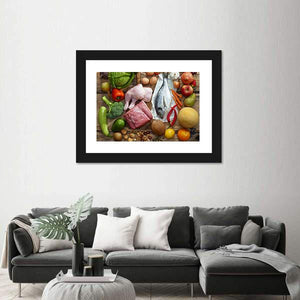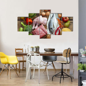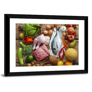 This canvas art features a vibrant flat lay of fresh produce, fruits, and raw meats that evoke a sense of abundance and health. The realistic style captures the beauty of natural foods, making it a great addition to your kitchen or dining area.