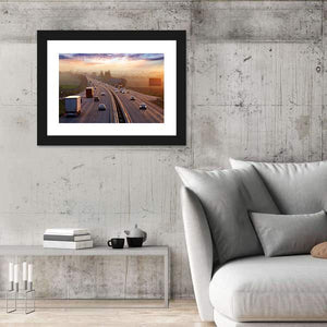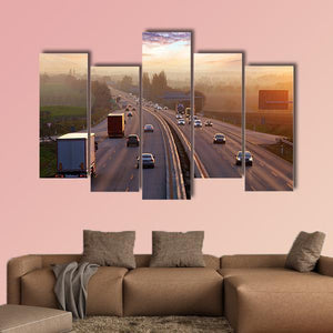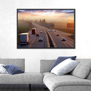 This photographic canvas shows highway traffic—long trucks and cars under a warm sunset sky, captured from a high aerial angle. Strong leading lines and a palette of orange, pink, gray and blue give the scene a calm, slightly busy mood. Its modern photographic look fits well in contemporary living rooms, hallways, or home offices.