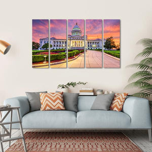 This canvas art captures the majestic beauty of a government building with its iconic dome, surrounded by manicured gardens and a glowing pathway. The vibrant sunset sky adds a dramatic touch, creating a serene atmosphere that enhances any space.
