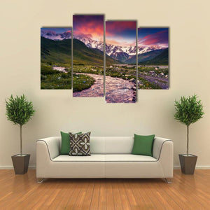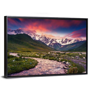 A realistic mountain landscape showing snow-capped peaks, pink and red sunset clouds, and a winding river through a green meadow. The composition uses rule-of-thirds and depth, with the river in the foreground for a dramatic yet serene mood. Suited to modern rooms and nature-themed decor.