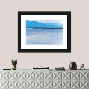 A group of flamingos wades in calm water, their pink forms reflected on the surface. The image’s realistic nature-photography style and rule-of-thirds composition create a serene, peaceful mood in soft blues, whites, pinks and greens. Suits modern or nature-inspired room decor.
