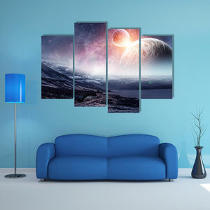 View Of Space Planets Canvas Wall Art presents two planets and a star-filled sky above mountains, with a winding road beside a body of water. The composition emphasizes depth and rule-of-thirds framing, using blue, purple, white, orange and grey to convey a cosmic, serene, otherworldly mood. It suits modern house room decor like living rooms and bedrooms.
