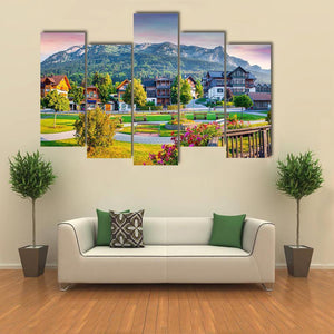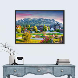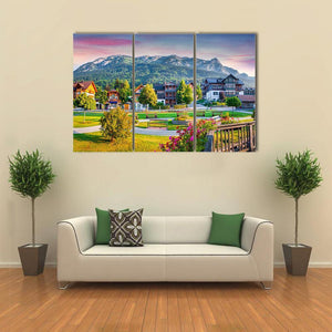 Village Archkogl In Morning Mist shows a quiet alpine village and snow-capped mountains beneath a pink-and-purple sunset sky, creating a serene, picturesque scene. Rendered in a realistic, vibrant style with trees, flowers, and traditional alpine buildings in a wide, eye-level view. Suited to modern interiors that want a calm focal piece.