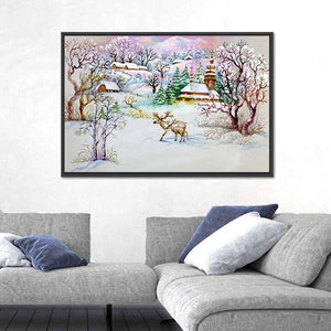 This beautiful watercolor piece depicts a serene winter village, complete with charming small houses and a solitary reindeer surrounded by elegant snow-covered mountains. Its vintage style and soft palette create a calm atmosphere, making it a perfect addition to any winter-themed decor.