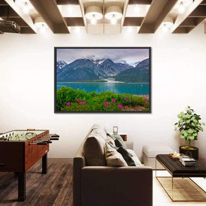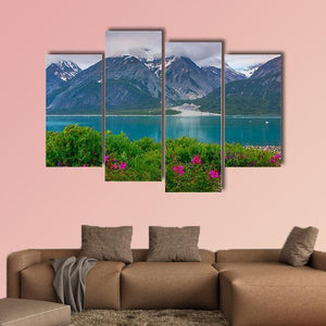 Wild Flowers in Glacier Bay National Park, Alaska presents a photorealistic landscape of pink wildflowers and lush green bushes before a blue lake and snow-capped mountains. The scene reads serene, majestic and vibrant with a cool palette of blues, greens, grays and whites. It works well in modern home interiors or nature-inspired rooms.