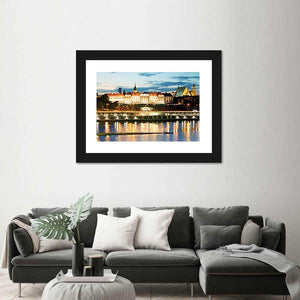 This beautiful canvas wall art features the Royal Castle in Warsaw, set against the serene backdrop of the Vistula River. The realistic depiction showcases illuminated buildings and their reflections on the water, capturing the tranquil mood of twilight.