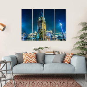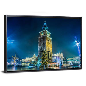 Experience the vibrant, festive spirit of Krakow with this stunning canvas wall art. Featuring a beautiful clock tower and a Christmas tree surrounded by illuminated buildings, it brings a magical night scene to life in your space.