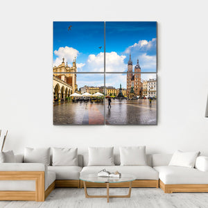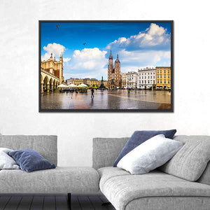 Capture the vibrant essence of Krakow with this stunning canvas featuring St. Mary's Basilica and the bustling Main Market Square. The artwork's palette of blue, gray, and yellow reflects a sunny day, bringing a historic yet lively feel to your space.