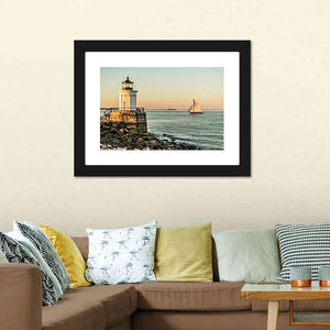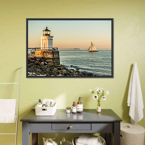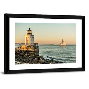 South Portland Bug Light Canvas Wall Art shows a realistic lighthouse beside a sailboat on calm ocean waters with a rocky shore and clear sky. The blue, white, tan, and grey palette creates a serene coastal mood. Suited to nautical or beach-inspired rooms and simple modern spaces.