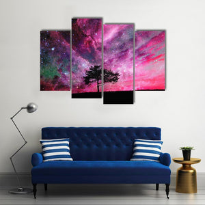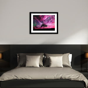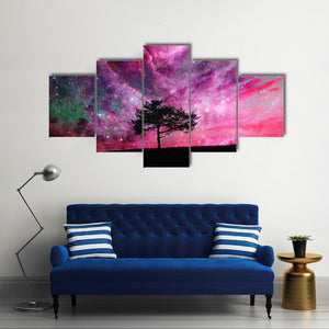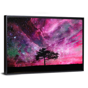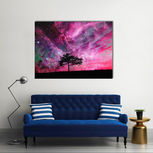 Silhouetted tree on a hill beneath a pink and purple nebula — this Red Alien Planet canvas sets a mysterious, dreamy, cosmic mood. Its abstract, modern landscape style suits contemporary living rooms or bedrooms as quiet, atmospheric wall decor.