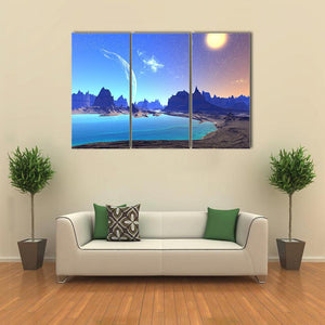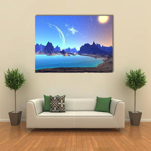 Beautiful Alien Planet Canvas Wall Art depicts an extraterrestrial landscape with a large crescent moon, a bright star, jagged rock formations and a reflective body of water. The blue, purple, tan and yellow palette creates a serene, otherworldly feeling. The piece suits modern homes and room decor with an interest in astronomy-inspired art.