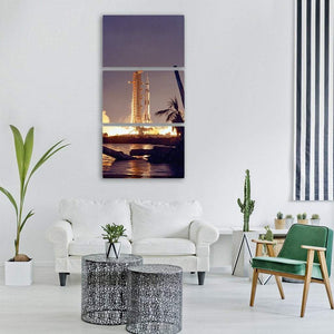 Apollo 14 Night Moon Canvas Wall Art depicts a night-time rocket launch over water, with flames erupting from the booster and their reflection on the surface. Rendered in a vintage, documentary style using orange, yellow, blue, and gray tones, the scene feels dramatic and powerful. Suited to modern or space-themed rooms as a bold focal piece.