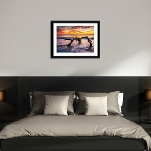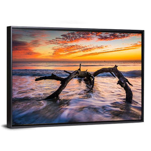 Atlantic Ocean At Sunrise Canvas Art depicts a seascape with centered driftwood as the sun rises over the water. Warm orange and yellow clouds blend with blue and purple tones while water flows around the driftwood, creating a serene yet dramatic atmosphere. The piece suits coastal or modern room decor.