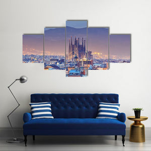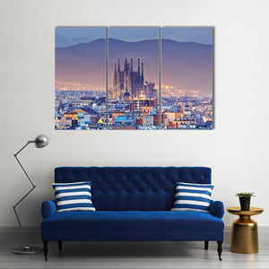 This stunning canvas wall art captures the Barcelona skyline with the iconic Sagrada Familia and distant mountains. The evening scene is beautifully rendered in rich shades of purple, blue, and gold, showcasing glowing city lights that create a vibrant atmosphere.