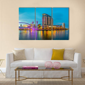 Lowry Theater Manchester Canvas Wall Art shows a vibrant nighttime cityscape with modern buildings, a distinct bridge and river reflections under blue, teal, purple, yellow and white lights. Illuminated windows and city lights create an urban, lively mood that works well in contemporary living rooms or offices.