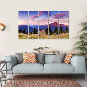 This tranquil artwork captures a serene mountain valley, with layers of majestic peaks and coniferous trees against a stunning sky. The peaceful blend of blue, purple, and green hues evokes a sense of calm, making it a perfect addition to any nature-inspired décor.
