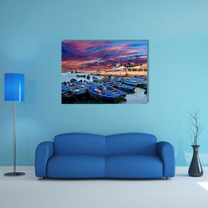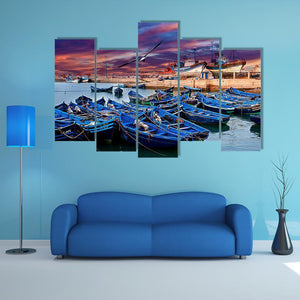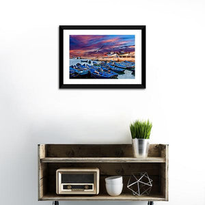 This beautiful canvas art captures the serene beauty of fishing boats at sunset in a Moroccan harbor. The blue and orange hues create a peaceful atmosphere that complements modern decor.